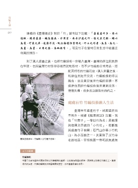 竹 編 工 藝 012 嘉義產竹多,用以 造紙,銷用甚廣。編為器具,亦用宏。而水沙連之竹,徑大至尺餘,縛以 為筏,可渡大洋,凌濤不沒,故沿海捕漁皆用之。竹工之巧者,為床、為几、 為籃、為筐,日用之器,各地俱有。 處處有竹 竹編技藝融入生活 鳳梨盛產期時,常編製大型竹籠子盛裝。 百工小辭典 竹編源始